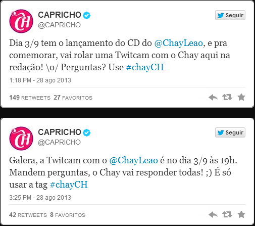 Para participar da twitcam basta mandar sua pergunta para @capricho com a tag #ChayCH. O CD já está em pré-venda pelos sites da SARAIVA, CULTURA e pelo ITUNES. Garanta já o seu!