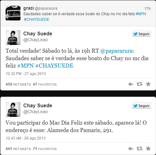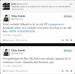 No próximo sábado (31/08), Chay Suede participará do 25º Ano do McDia Feliz, em São Paulo. O Evento realizado pela rede de fast food, tem como objetivo ajudar adolescentes e crianças com câncer.