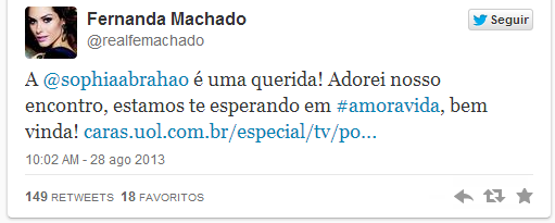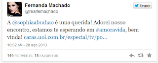 Na noite de ontem (27), Sophia Abrahão realizou uma twitcam para seus fãs, durante a conversa a ruiva mostrou estar ansiosa para entrar na novela de Walcyr Carrasco, e soltou diversos elogios para o elenco da trama. Além de afirmar adorar o personagem de Mateus Solano, Félix. A atriz também comentou que havia encontrado com Fernanda Machado, interprete de Leila, que faz parte do mesmo núcleo que Sophia irá integrar.Na manhã desta segunda-feira (28), Fernanda escreveu em sua conta no twitter: “A @sophiaabrahao é uma querida! Adorei nosso encontro..” contou a atriz, que também parece ansiosa para contracenar ao lado de Sophia. Veja abaixo o tweet:
